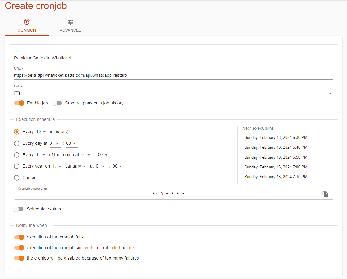 Caso queira usar o serviço gratuito da www.cron-job.org, siga o guia conforme representado em CronJob