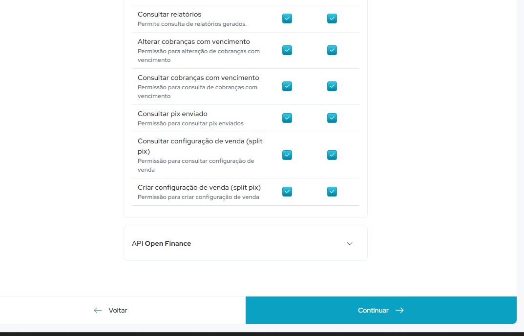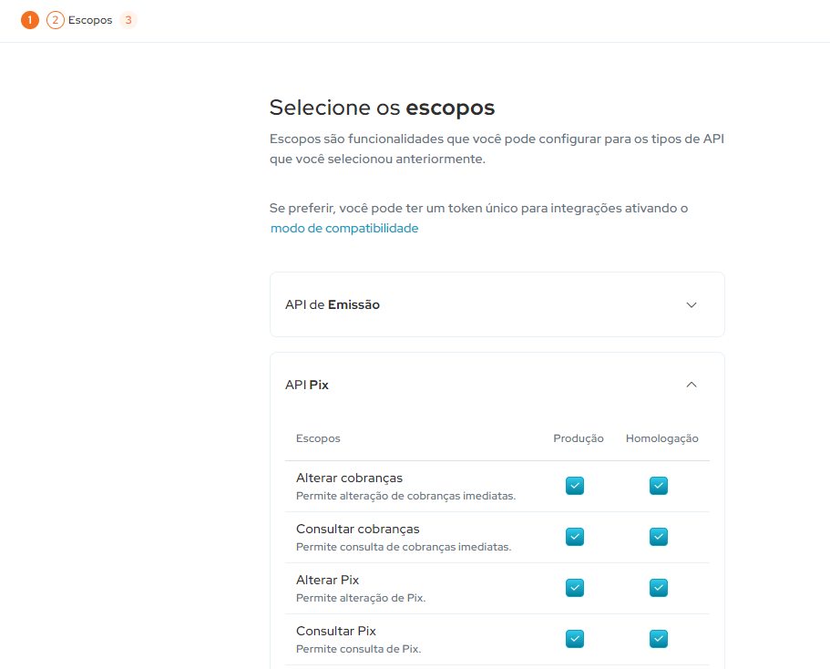 Escolha o escopo API PIX e marque TODAS as caixas em PRODUÇÃO e HOMOLOGAÇÃO: