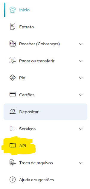 Após acessar sua conta Efí, acesse o menu a esquerda e escolha API: