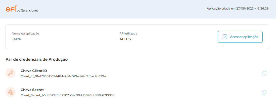 Você precisará criar uma Aplicação PIX em sua conta Efí e uma Chave Pix Aleatória na conta Efí.